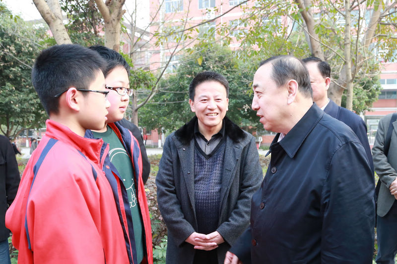 在德陽外國語學校,楊志明一行先后參觀了學校警校共育辦公室、消防體驗館和圖書館,對優美的校園環境、完備的教育教學設施、良好的師生風貌給予充分肯定。同學們的朝氣蓬勃、謙恭禮讓、尊老愛幼的行為讓調研組很是欣慰。看到同學們從旁邊經過,楊志明關切地詢問起他們平日的學習生活情況,當聽到同學們說在德外學習很幸福時,他非常高興,他說,教育的意義不僅在于提高人的科學文化水平,還在于提升人的幸福感,讓整個社會充滿正能量,德外培養的學生不僅成績好,綜合素質也非常高,是素質教育的典范。